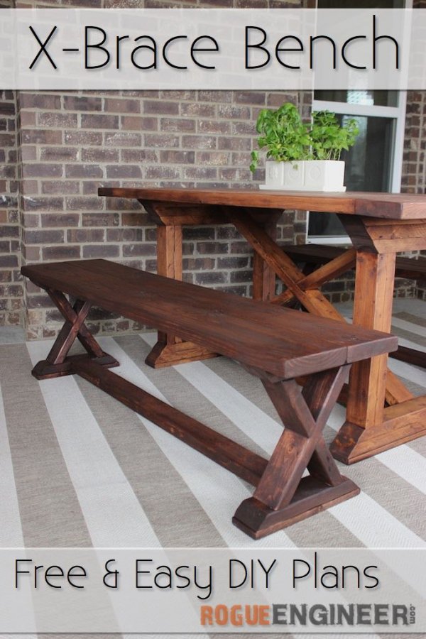 This is a beautiful DIY bench in lovely wood stain. Materials needed for this project are pine lumber, boards, and studs. You will also need pocket hole screws and 2-inch wood screws. Check out the comprehensive tutorial below for the plans and the step-by-step guide on making your own X-brace bench.